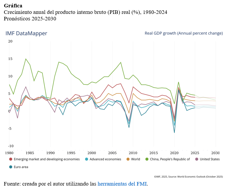 La gráfica presenta los pronósticos del FMI sobre el crecimiento del producto interno bruto (PIB) real en 2026. Los pronósticos indican que la economía global crecerá 3% en 2026, mientras que el crecimiento esperado es 2% en los EE. UU. y 4.5% en China. Las economías avanzadas crecerán 1.5% y las economías emergentes y en desarrollo 4%.